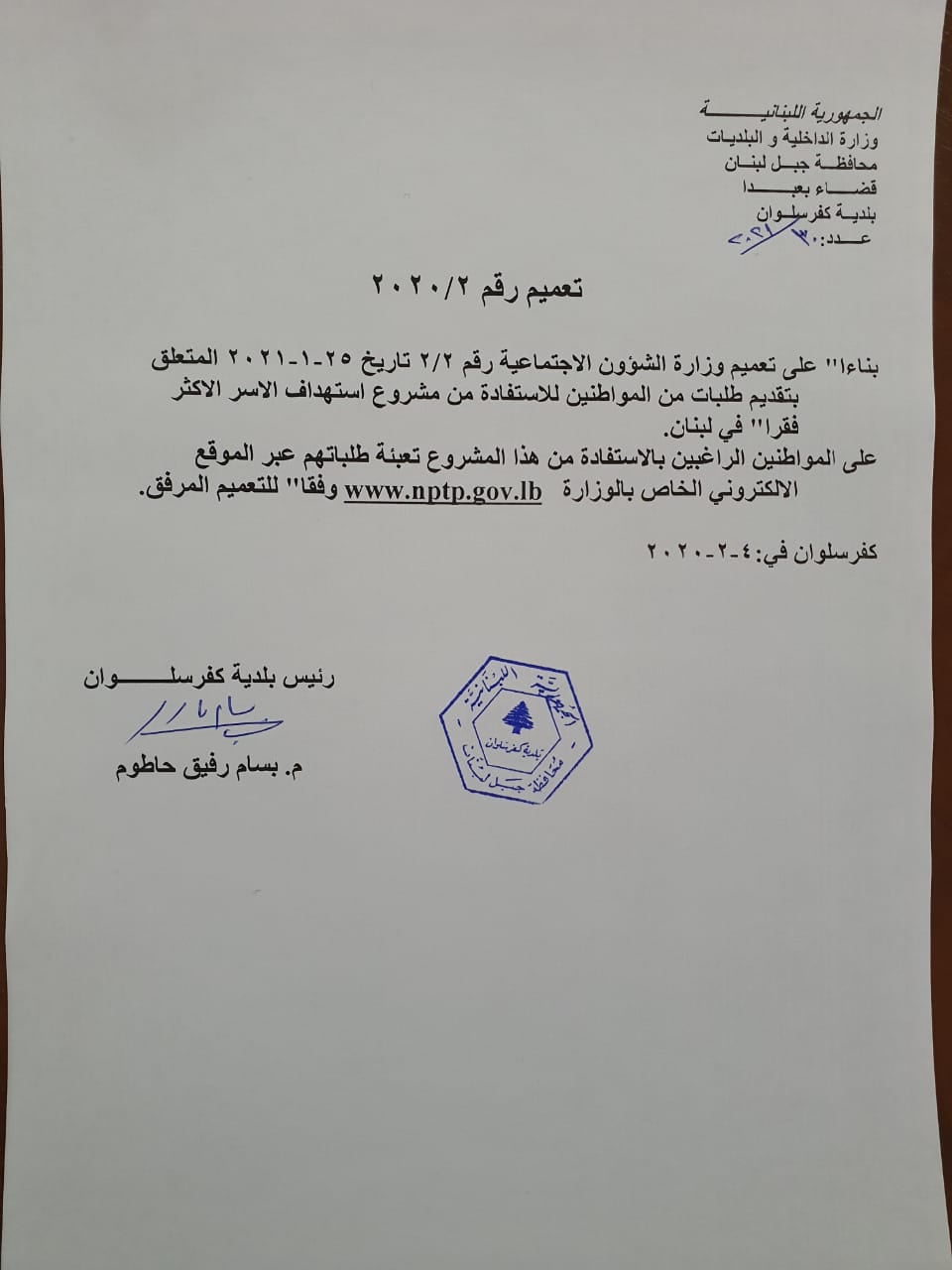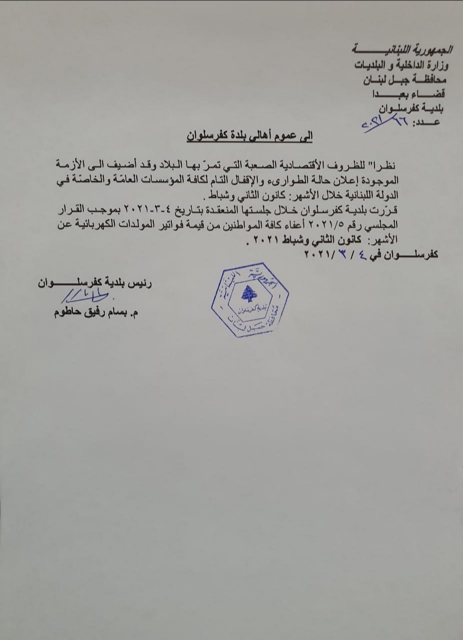 الجمهورية اللبنانية وزارة الداخلية والبلديات محافظة جبل لبنان بلدية كفرسلوان نظرا" لخطورة الوضع الصحي الذي نتج عن إنتشار وباء كورونا في البلاد مما تسبب بزيادة الضغط على المستشفيات وتحسبا" لعدم قدرتها على أستقبال المرضى والمصابين وتخوفا" من حصول الأسوأ في الأيام القادمة بناءا" عليه عمدت بلدية كفرسلوان بالتعاون مع الصليب الاحمر اللبناني فرع فالوغا وخلية الأزمة في المتن الاعلى الى إنشاء خلية طوارئ وقامت بتامين وشراء تجهيزات خاصة بمعالجة الكورونا سيستفيد منها ابناء البلدة المصابين بالفايروس ولم تتوفر لهم امكانية الدخول الى المستشفى لتلقي العلاج. وهذه التجهيزات عبارة عن: 1- اجهزة تنفس اصطناعي 2- اجهزة فحص نسبة الاوكسيجين ودقات القلب 3- اجهزة فحص الحرارة 4- لباس خاص للكورونا 5- كمامات وكفوف وباقي اللوازم الاخرى 6- منظم اوكسيجين طبي 7- قناني اوكسيجين مع رجاءنا الدائم لأهلنا بإتخاذ كافة اجراءات الوقاية الازمة والتزامهم بالتعليمات المتعلقة بمنع انتشار الوباء. رئيس بلدية كفرسلوان م. بسام رفيق حاطوم